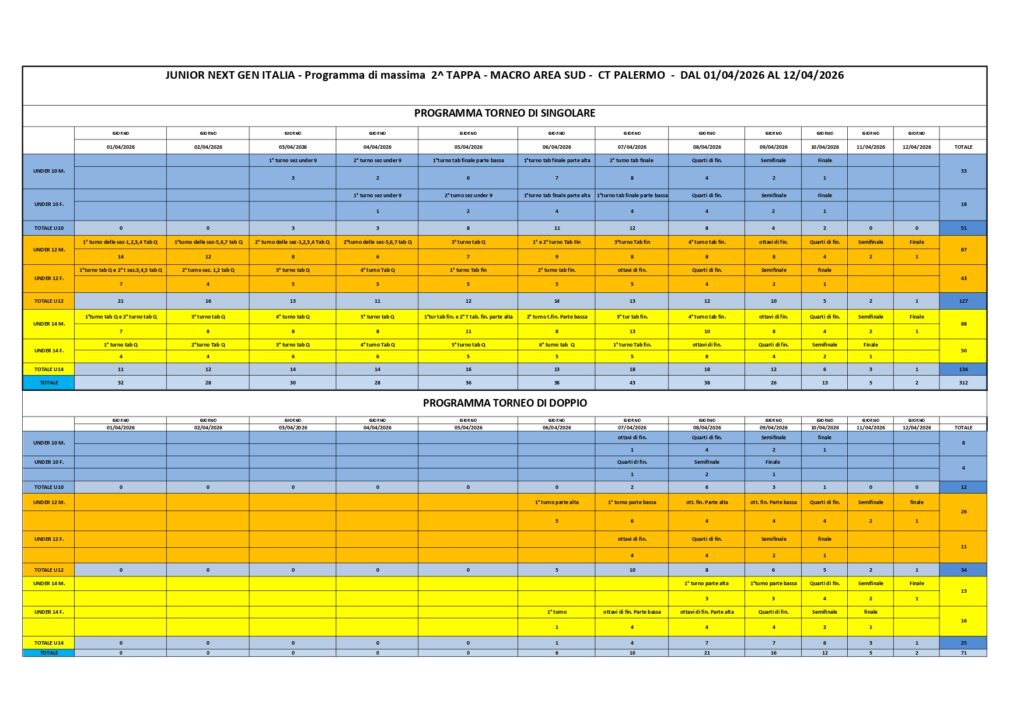 Programmazione gare singolare e doppio. In gara ben 325 giovani atleti provenienti da Sicilia, Calabria e Campania.