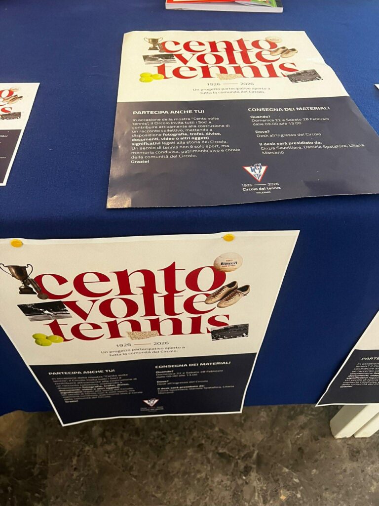 In occasione della mostra “𝐂𝐞𝐧𝐭𝐨 𝐯𝐨𝐥𝐭𝐞 𝐭𝐞𝐧𝐧𝐢𝐬”, il Circolo invita tutti i Soci a contribuire attivamente alla costruzione di un racconto collettivo, mettendo a disposizione fotografie, trofei, divise, documenti, video o altri oggetti significativi legati alla storia del Circolo. Un secolo di tennis non è solo sport, ma memoria condivisa, patrimonio vivo e corale della comunità del Circolo.