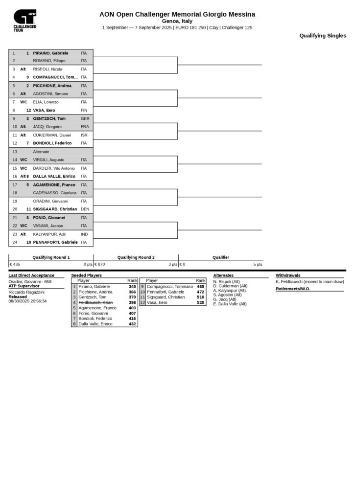 𝑮𝒂𝒃𝒓𝒊𝒆𝒍𝒆 𝑷𝒊𝒓𝒂𝒊𝒏𝒐, numero 345 al mondo, è la testa di serie numero 1 del tabellone delle qualificazioni del ricco 𝗖𝗵𝗮𝗹𝗹𝗲𝗻𝗴𝗲𝗿 𝟭𝟮𝟱 sulla terra rossa di 𝗚𝗲𝗻𝗼𝘃𝗮.