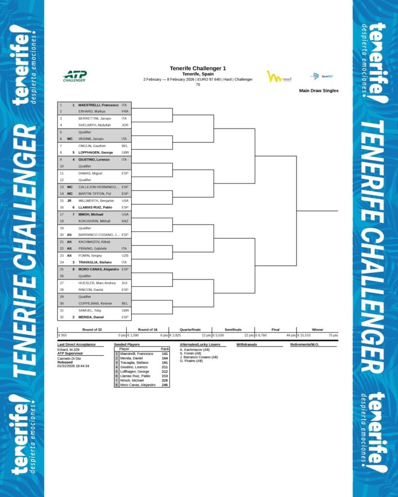 Al nastri di partenza, nel main draw del 𝗖𝗵𝗮𝗹𝗹𝗲𝗻𝗴𝗲𝗿 𝟕𝟓 sul veloce di 𝗧𝗲𝗻𝗲𝗿𝗶𝗳𝗲, 𝑮𝒂𝒃𝒓𝒊𝒆𝒍𝒆 𝑷𝒊𝒓𝒂𝒊𝒏𝒐 il quale sfiderà al 1° turno il 23enne russo Alibek Kachmazov, n. 369 al mondo. Il tabellone principale scatterà lunedì 2 febbraio. Il tennista mancino torna a giocare un torneo sul cemento dopo diverso tempo dall’ultima volta (Challenger 50 Pozoblanco luglio 2024). Presente sul posto, uno dei suoi coach, ovvero Daniele Capecchi.