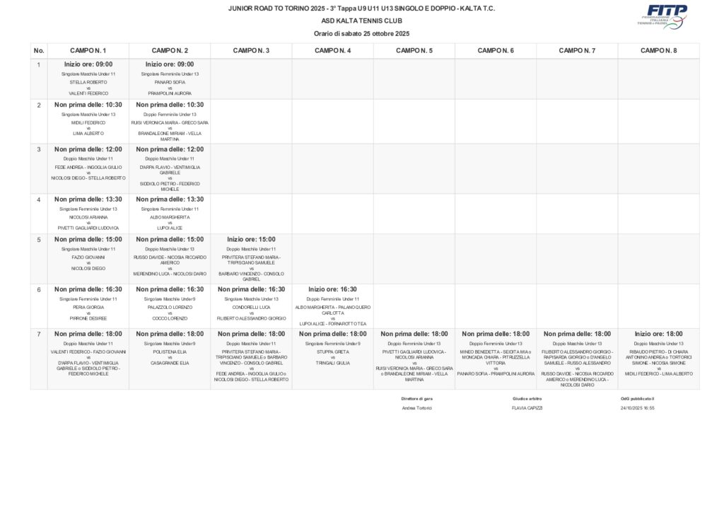 Disputeranno le semifinali del singolare maschile under 9 e under 13 𝑳𝒐𝒓𝒆𝒏𝒛𝒐 𝑪𝒐𝒄𝒄𝒐 e 𝑨𝒍𝒃𝒆𝒓𝒕𝒐 𝑳𝒊𝒎𝒂 e del singolare femminile under 11 e under 13 𝑮𝒊𝒐𝒓𝒈𝒊𝒂 𝑷𝒆𝒓𝒊𝒂 e 𝑳𝒖𝒅𝒐𝒗𝒊𝒄𝒂 𝑷𝒊𝒗𝒆𝒕𝒕𝒊.