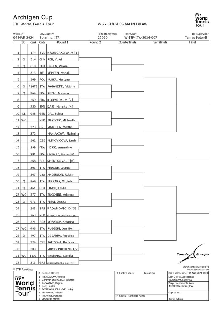 Con il punteggio di 7-5 6-3 Virginia Ferrara sconfigge nel 2° e ultimo turno delle “quali” la britannica Emily Smith (best ranking 240) e si assicura un posto per il tabellone principale del torneo di scena sul carpet di Solarino. Virginia raggiunge l’amica e compagna di squadra in serie A1 Giorgia Pedone. Martedì in campo Giorgia, mercoledì Virginia.