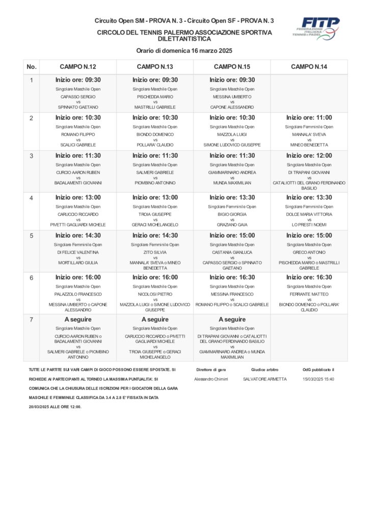 Torneo Open CTP: ordine di gioco domenica 16 marzo