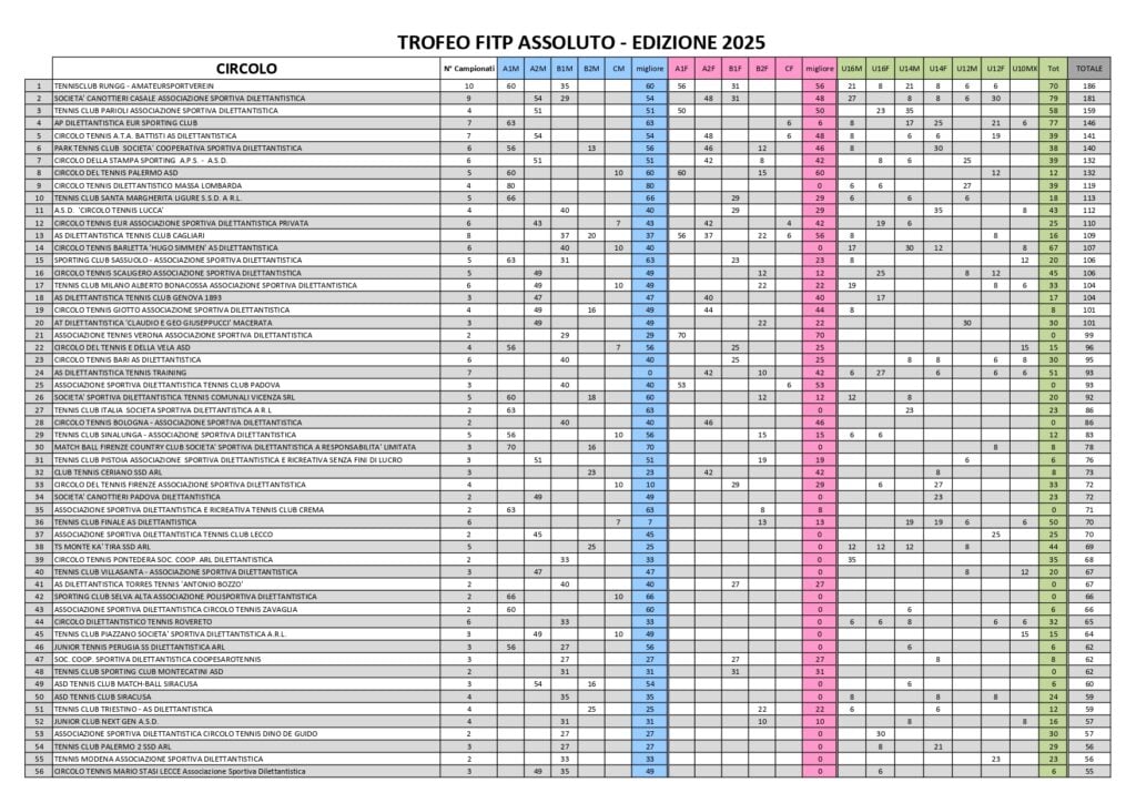Nella giornata di venerdì 12 dicembre sono state rese note le classifiche relative al trofeo Fitp. Nell’assoluto, il Ct Palermo ha chiuso 8° con 132 punti all’attivo. Ad aggiudicarsi la vittoria è stato il Tc Rungg Bolzano che ha totalizzato 186 punti. Ricordiamo che nel 2024, il club di viale del Fante aveva chiuso al 3° posto e nel 2023 si era aggiudicato il successo di questo prestigioso trofeo per sodalizi che tiene conto dei risultati nei campionati dalla serie A alla serie C e di quelli giovanili.