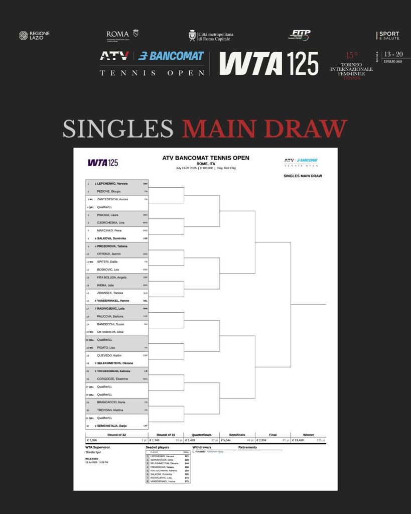 𝑮𝒊𝒐𝒓𝒈𝒊𝒂 𝑷𝒆𝒅𝒐𝒏𝒆, numero 216 al mondo, nel confronto di 1° turno del 𝗪𝘁𝗮 𝟭𝟮𝟱 sulla terra rossa dell’Antico Tiro a Volo a 𝗥𝗼𝗺𝗮, nella giornata di lunedì 14 luglio, affronterà la prima testa di serie del tabellone ovvero la 39enne statunitense Varvara Lepchenko, n. 121 del ranking mondiale che vanta nn best ranking da numero 19 nel 2012.